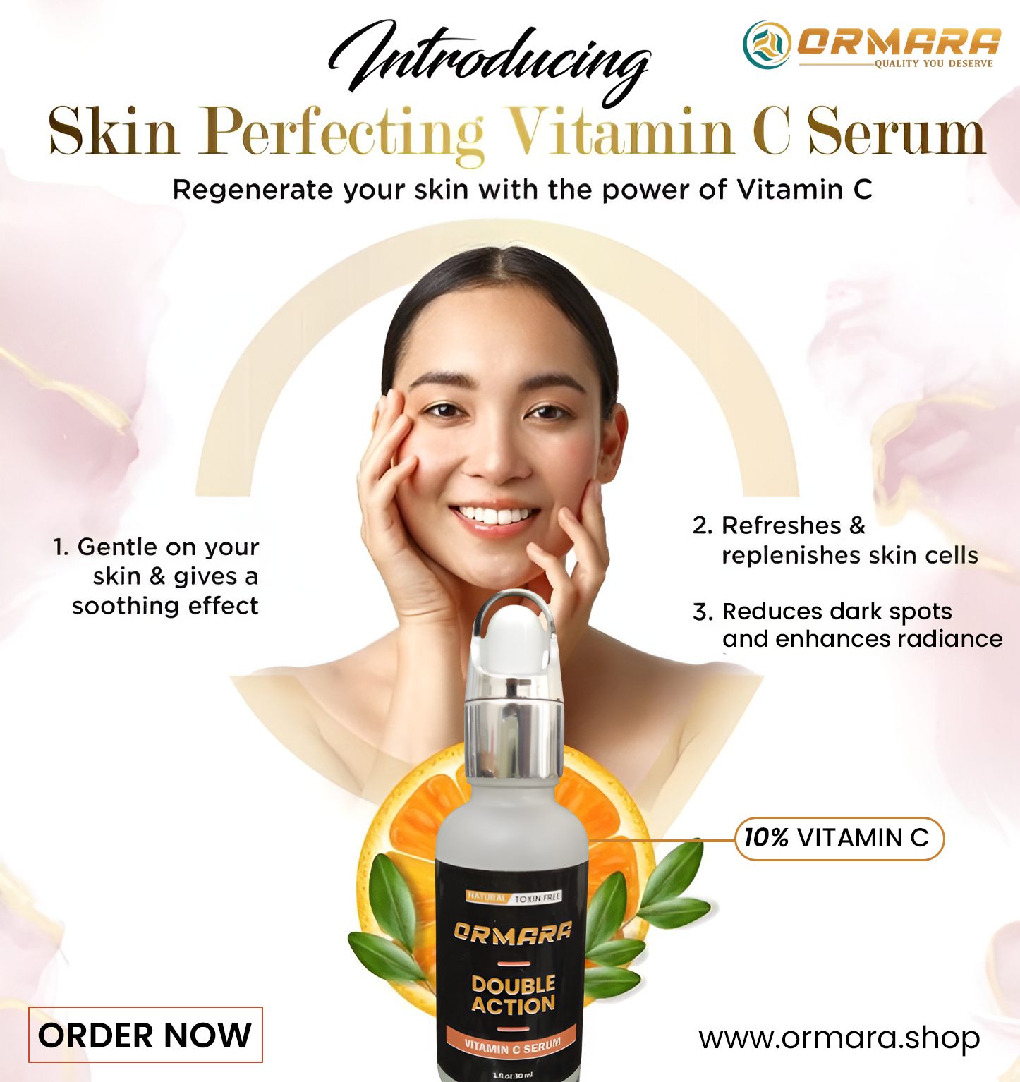 Rediscover your skin’s natural radiance with Ormara Double Action Vitamin C Serum—a scientifically formulated, multi-benefit serum designed to nourish, repair, and visibly transform your complexion. Crafted with a powerful synergy of 10% Vitamin C, 2% Hyaluronic Acid, and 2% Ferulic Acid, this serum is your complete solution for brighter, firmer, smoother skin.